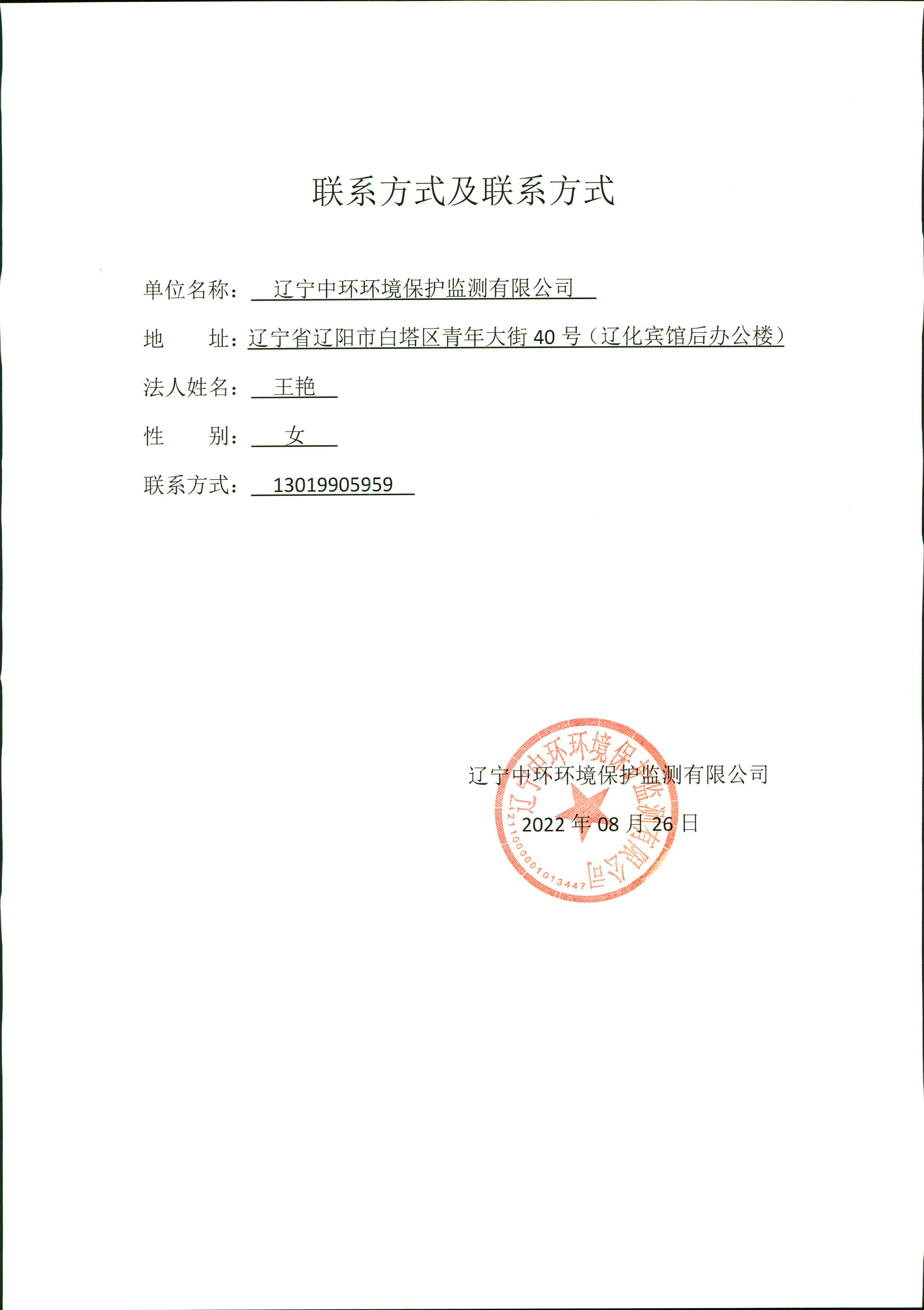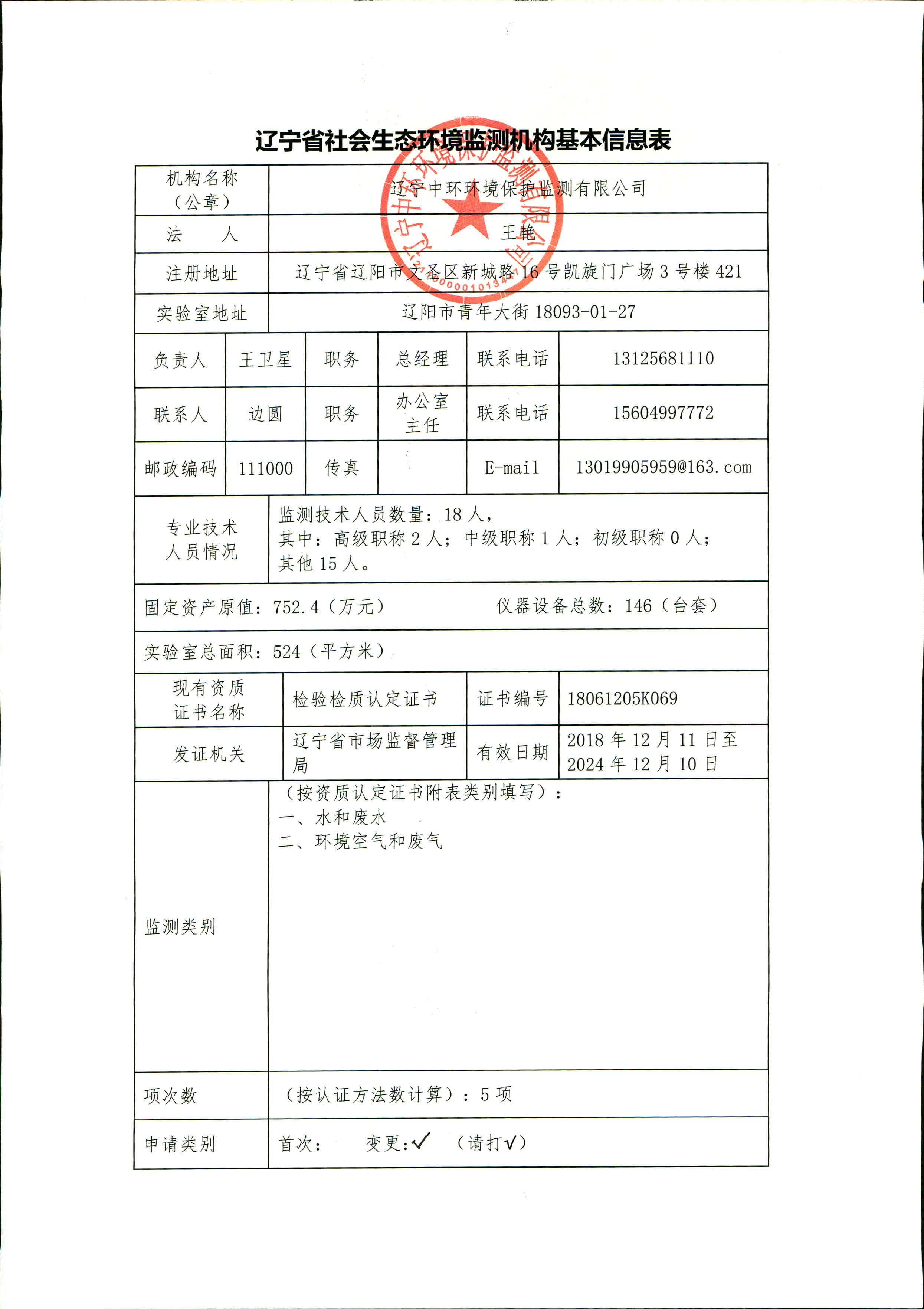 辽宁中环环境保护监测有限公司基本信息公开