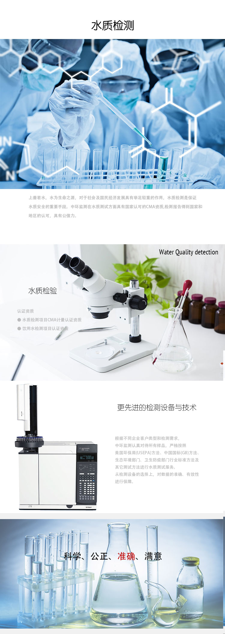 根据不同企业客户类型和检测需求,中环监测认真对待所有样品,严格按照美国环保局(USEPA)方法、中国国标(GB)方法、生态环境部门、卫生防疫部门行业标准方法及其它测试方法进行水质测试服务。如果您有关于水质方面的检测需求,欢迎与我们联系。